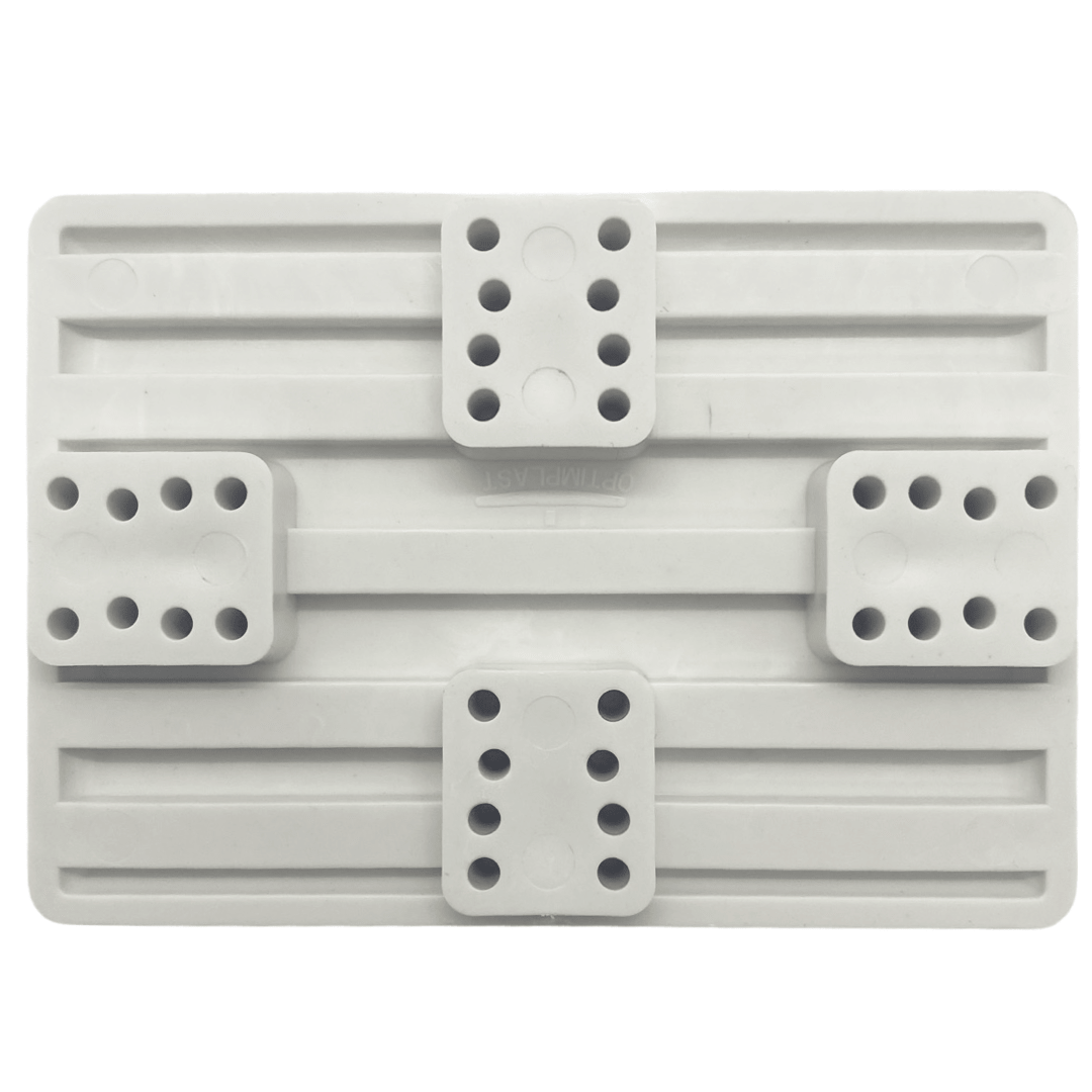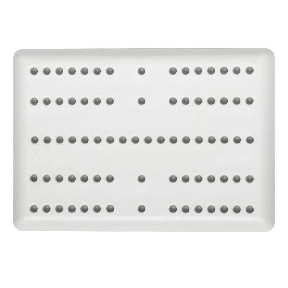 На поверхность площадки нанесены отверстия для саморезов, края площадки закруглены, имеет четыре точки крепления к потолку.