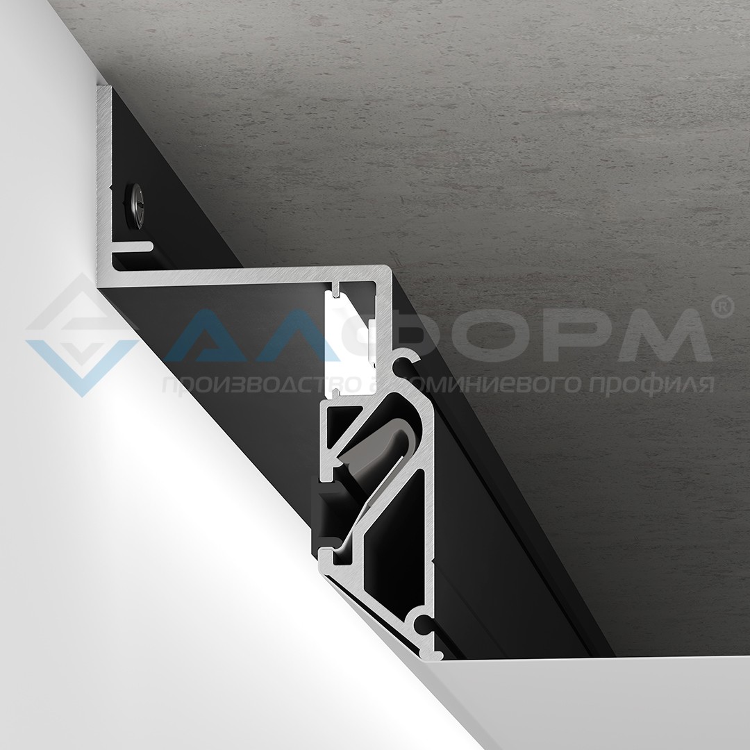 Алюминиевый профиль для монтажа натяжного потолка из ПВХ пленки на гарпунной системе крепления с возможностью организации парящего эффекта с увеличенным зазором и подсветкой вдоль периметра помещения.