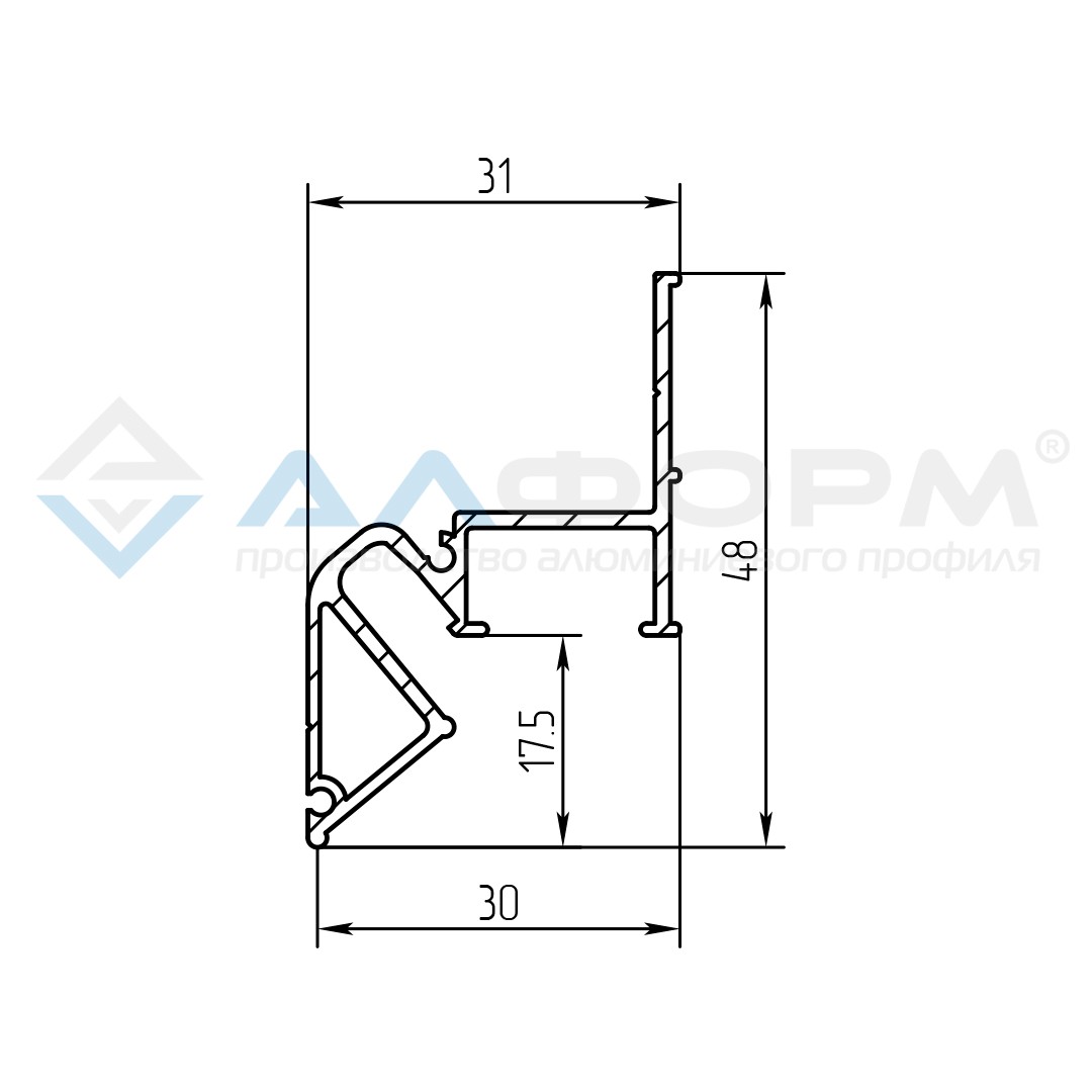 Алюминиевый профиль для монтажа натяжного потолка из ПВХ пленки на гарпунной системе крепления с возможностью организации парящего эффекта с подсветкой вдоль периметра помещения.