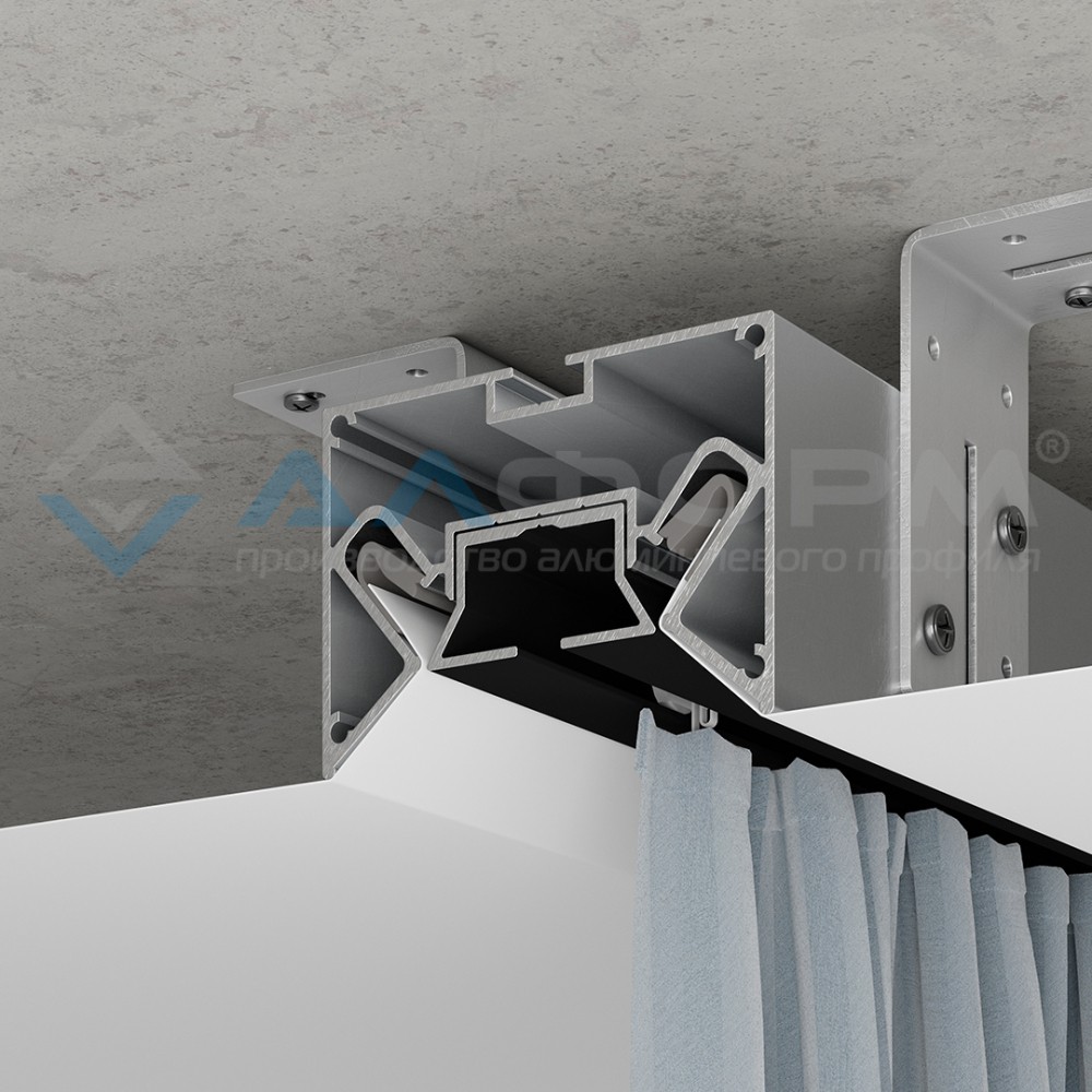 Алюминиевый профиль однорядного карниза устанавливается в профиль адаптер X25 и закрывает пазы для крепления гарпуна.